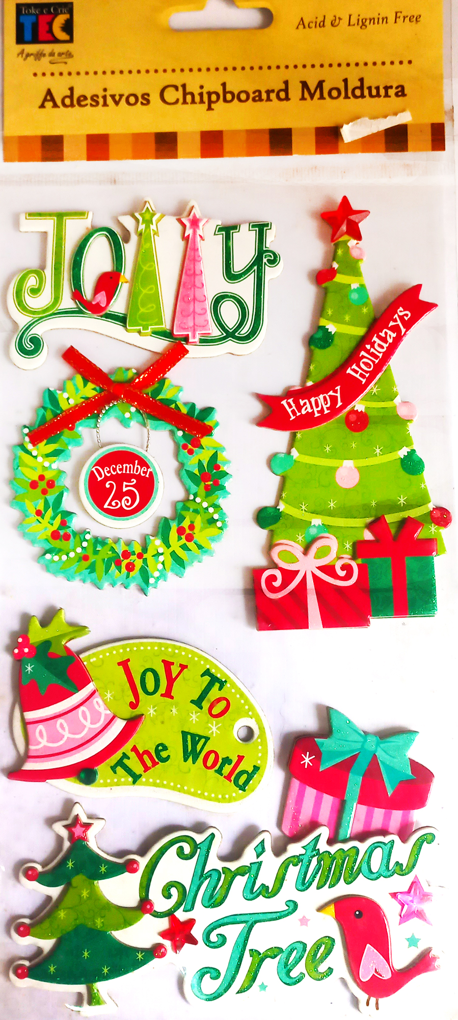 Cartela de adesivos em chipboard (tipo um papelão mais grosso que o papel) com aplicação de glitter, contém 6 imagens, ideal para páginas de scrapbook, decoração de álbuns fotográficos, journaling books, decoração de agendas e scrapbooking.